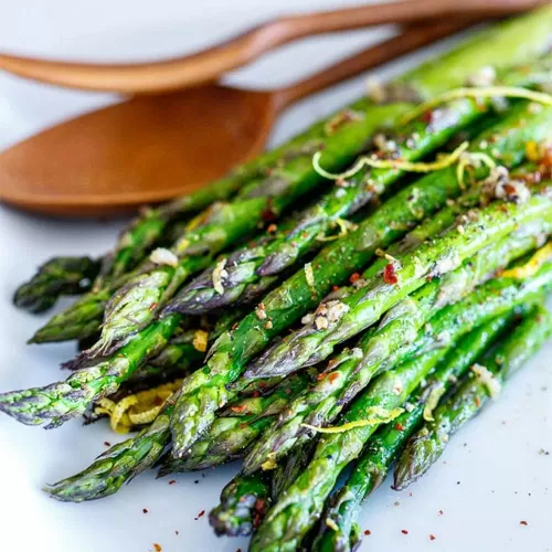Preheat oven to 400F. Toss the trimmed asparagus in a bowl with olive oil, garlic, lemon zest, salt & pepper. Lay spears out in a single layer on a parchment-lined sheet pan. Roast until just tender yet still vibrant green, about 15-25 minutes, depending on size and thickness, tossing halfway through. Once tender, toss with lemon juice. Taste and adjust salt. Garnish with any of the optional garnishes.